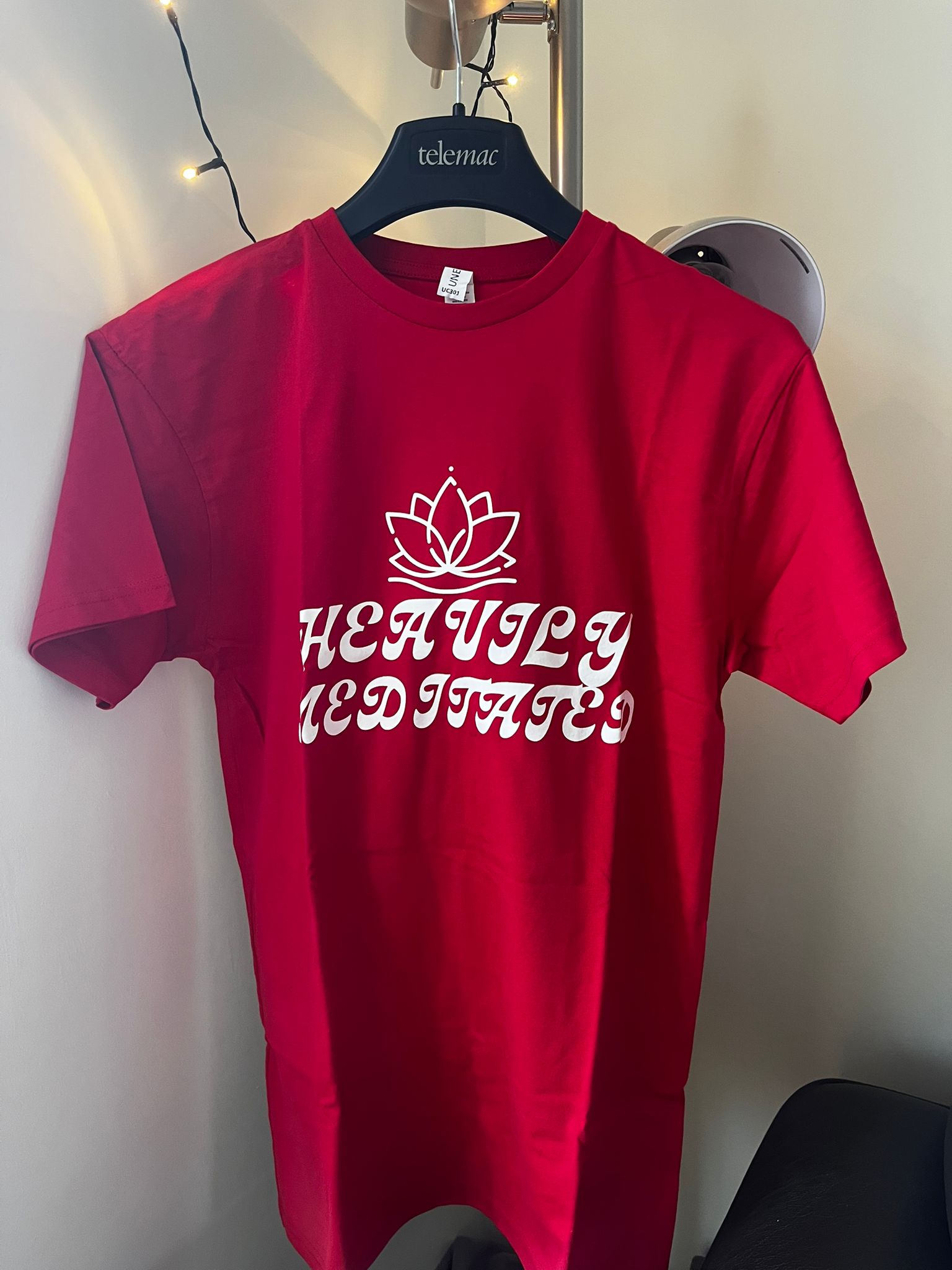 Heavily Meditated T-Shirt, for both men and women.  This fabulous and funny T comes in Natural, Sand, White, Light Blue and Sport Grey.  These shapes and sizes are kind to the figure and the environment.   We know you will love wearing your T with pride.